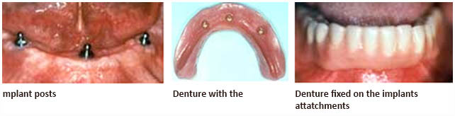 Finally, our Dentists attach a permanent crown to the post to replace the missing tooth Implant post(abutment) The crown is cemented over the post Implant Bridge Implant posts The bridge is cemented on the posts Implant supported denture Implant postsDenture with the Denture fixed on the implants attatchments
