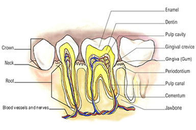 Each tooth has a crown that projects above the gum margin and a root that is embedded in bone beneath the gum. Structurally, each tooth is composed of the pulp in the centre; the dentine surrounding the pulp and the enamel which covers the crown of the tooth.