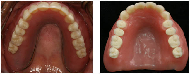 A "denture-like" implant prosthesis that is not removable, by the patient, but is removable by the dentist if needed for maintenance purposes. The prosthesis is secured to the implants with screws, and the holes are filled with tooth colored material (as seen in the photo on the left). This particular design is only indicated for certain situations, where all of the esthetic and functional goals are able to be met An implant-supported denture is used when a person doesn't have any teeth in the jaw, but has enough bone in the jaw to support implants.
