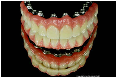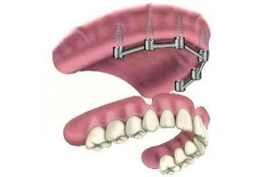A "denture-like" implant prosthesis that is not removable, by the patient, but is removable by the dentist if needed for maintenance purposes. The prosthesis is secured to the implants with screws, and the holes are filled with tooth colored material (as seen in the photo on the left). This particular design is only indicated for certain situations, where all of the esthetic and functional goals are able to be met An implant-supported denture is used when a person doesn't have any teeth in the jaw, but has enough bone in the jaw to support implants.