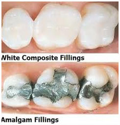 Composite resin fillings are the most common alternative to dental amalgam. They are sometimes called “tooth-colored” or “white” fillings because of their color. Composite resin fillings are made of a type of plastic (an acrylic resin) reinforced with powdered glass. The color (shade) of composite resins can be customized to closely match surrounding teeth.
